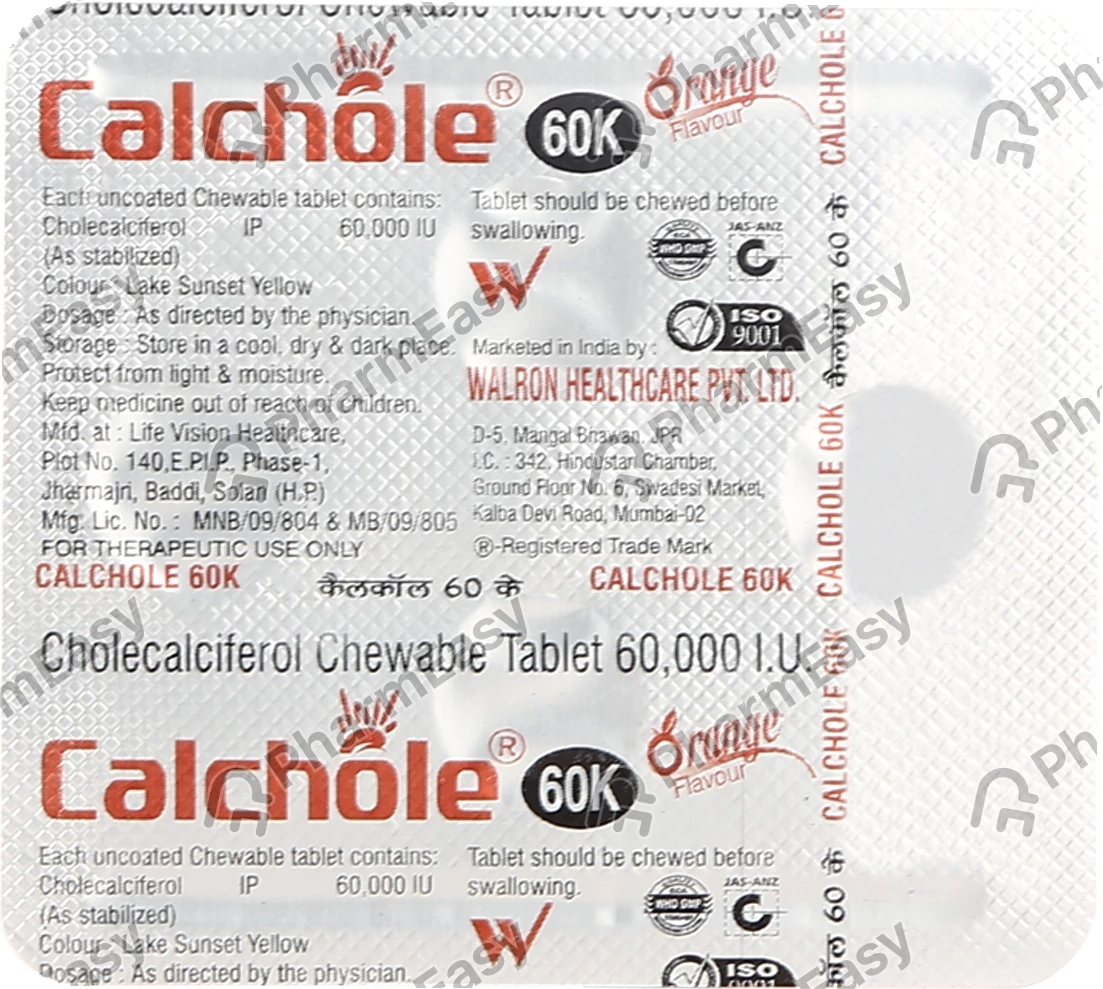 Calchole 60 K Tablet combines Calcium Carbonate and Cholecalciferol (Vitamin D3), essential nutrients that promote strong bones by aiding calcium absorption and maintaining proper calcium and phosphorus balance.