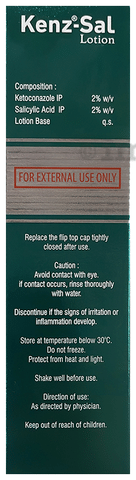 Kenz-Sal 2% Lotion is a topical formulation designed to treat fungal infections of the scalp and skin, particularly those associated with dandruff and seborrheic dermatitis. It combines Ketoconazole, an antifungal agent, with Salicylic Acid, a keratolytic that helps remove dead skin and scales. This combination helps reduce itching, flaking, and inflammation, while also preventing fungal growth.