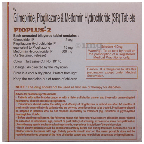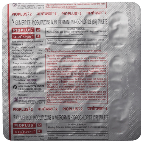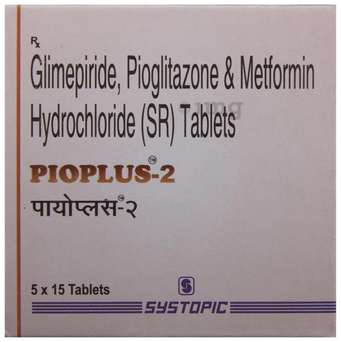 - Pioplus 2/500/15 Mg Tablet is an oral antidiabetic medication formulated to manage Type 2 Diabetes Mellitus. It combines three active ingredients—Glimepiride, Metformin, and Pioglitazone—to effectively control blood sugar levels in adults.​