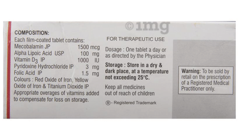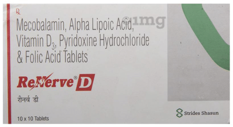 Renerve D Tablet is a nutritional supplement combining Methylcobalamin (1500 mcg), Alpha Lipoic Acid (100 mg), Vitamin B6 (Pyridoxine) (3 mg), Folic Acid (1.5 mg), and Vitamin D3 (1000 IU). It is primarily used to manage diabetic neuropathy and nutritional deficiencies, supporting nerve health and overall well-being.