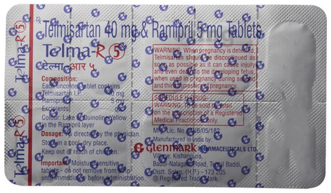 Telma-R 40/5 mg Tablet is a combination medication used primarily to treat high blood pressure (hypertension) and manage heart failure. This medication combines two active ingredients: Telmisartan (40 mg), an angiotensin II receptor blocker (ARB), and Ramipril (5 mg), an ACE inhibitor. These components work together to help relax blood vessels, improving blood flow and reducing blood pressure.
