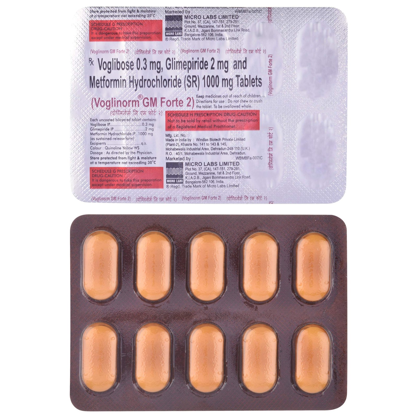 Voglinorm GM Forte contains Voglibose (0.3 mg), Metformin (1000 mg), and Glimepiride (2 mg). This triple-drug combination works together to lower blood glucose levels through multiple mechanisms: improving insulin sensitivity, increasing insulin secretion, and slowing down carbohydrate absorption.